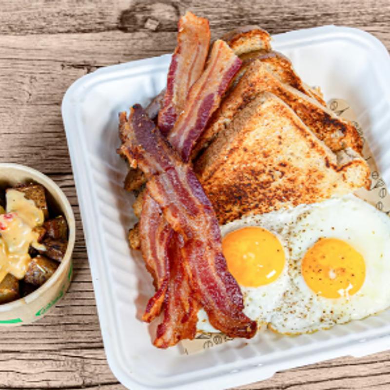 2 Thick-cut bacon slices, 4oz sausage patty, or plant-based sausage